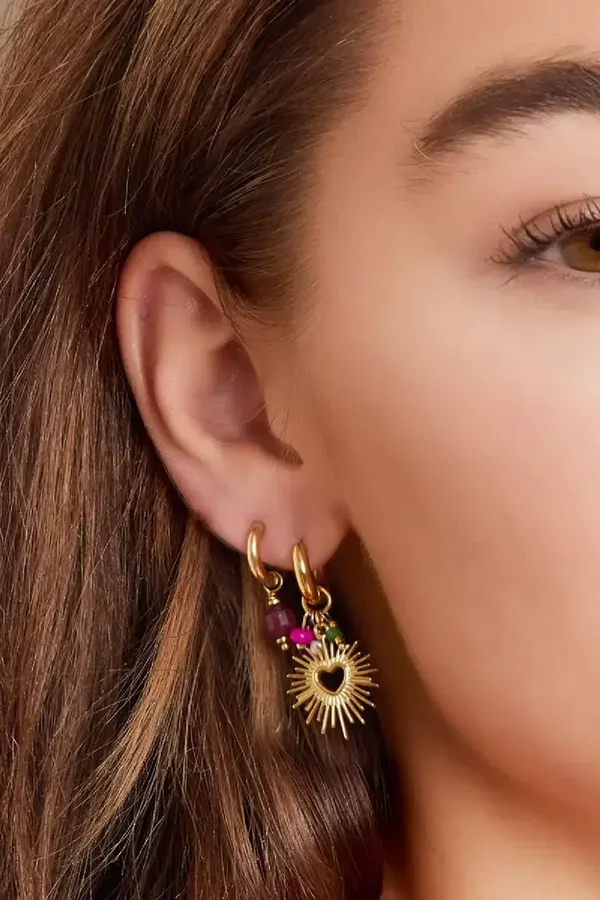 De oorbellen zijn gemaakt van stainless steel in de kleur goud in combinatie met glaskralen in de kleur roze groen en beige. De oorbellen zijn 3,7 cm lang.